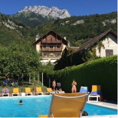After recovering from the lost wallet episode we restarted our planned visit to Annecy, on the Lake of the same name.  It was School holidays and hectically crowded.  We likened it to Mount Maunganui on Near Year’s eve, so we didn’t stop, but travelled further on down the lake and spent a night and the next day at a little 2star hotel in a quiet little treasure spot of a beach (found for us with the help of the Office du Tourisme).