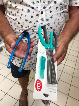 At left are a couple of items that we didn’t buy, but they made us laugh. See John holding a peeler that will do both sides of the carrot at once and a pair of scissors that cut herbs pretty quickly.