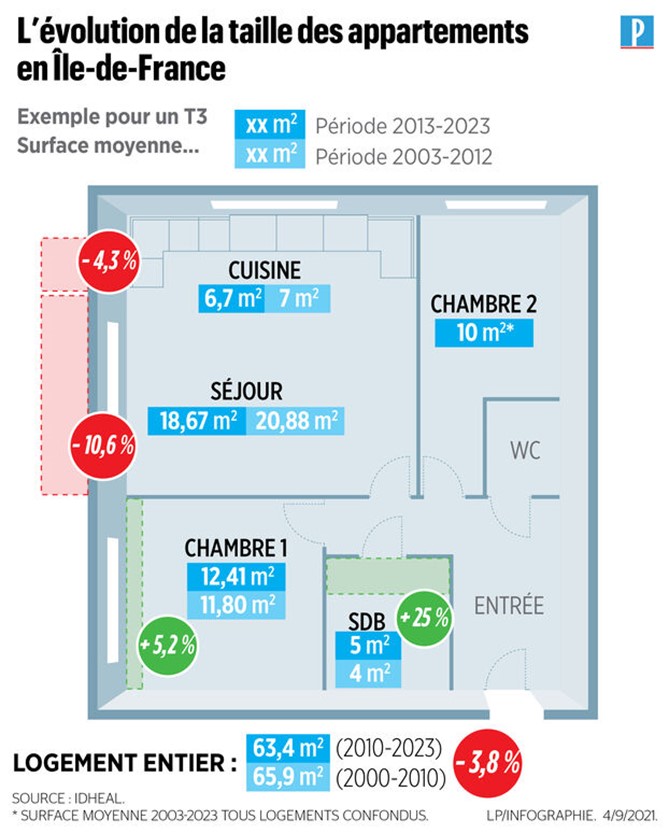 Le rétrécissement des pièces fait qu’on confond cuisine et salon. Les cuisines ont diminué en raison de l’évolution de nos modes de vie : en ville, on peut aller au restaurant, se faire livrer les repas… Concernant la chambre, on peut aussi se dire que si la pièce à vivre est suffisamment grande, pas besoin que l’espace nuit soit conséquent. Mais la pandémie a eu un effet crash-test sur nos logements. On s’est rendu compte qu’ils pouvaient avoir d’autres usages. Qu’il n’était pas idiot, en raison du télétravail, de pouvoir installer un bureau dans sa chambre par exemple. Les salles de bains ont gagné 1 mètre carré avec l’application des normes PMR (Personne à Mobilité Réduite) et 80 % des plans disposent d’un espace extérieur, mais leur taille baisse. Près de 62 % des balcons ont une profondeur inférieure à 1,50 mètre, ce qui permet difficilement d’y installer une table par exemple. On manque cruellement de rangements dans le bâti de ces vingt dernières années.