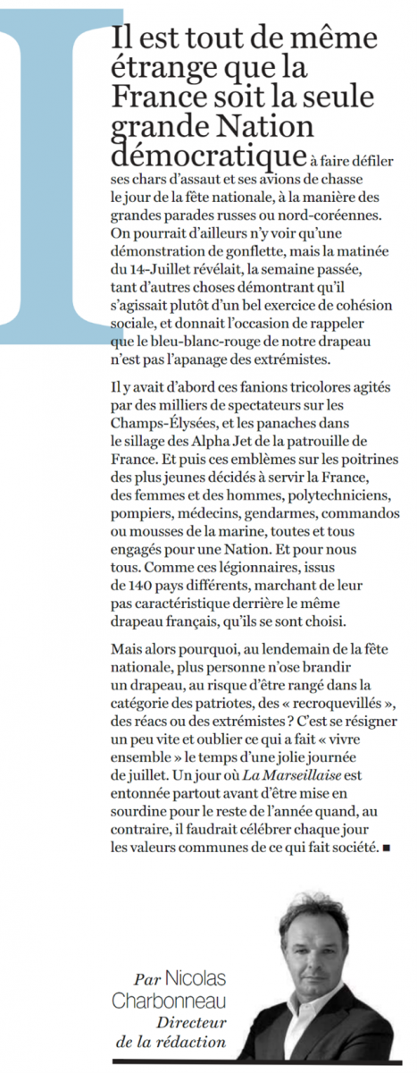 Dans son éditorial dans le Parisien Weekend cette semaine, Nicolas Charbonneau, le directeur de la rédaction, a soulevé une question que je trouve intéressante.