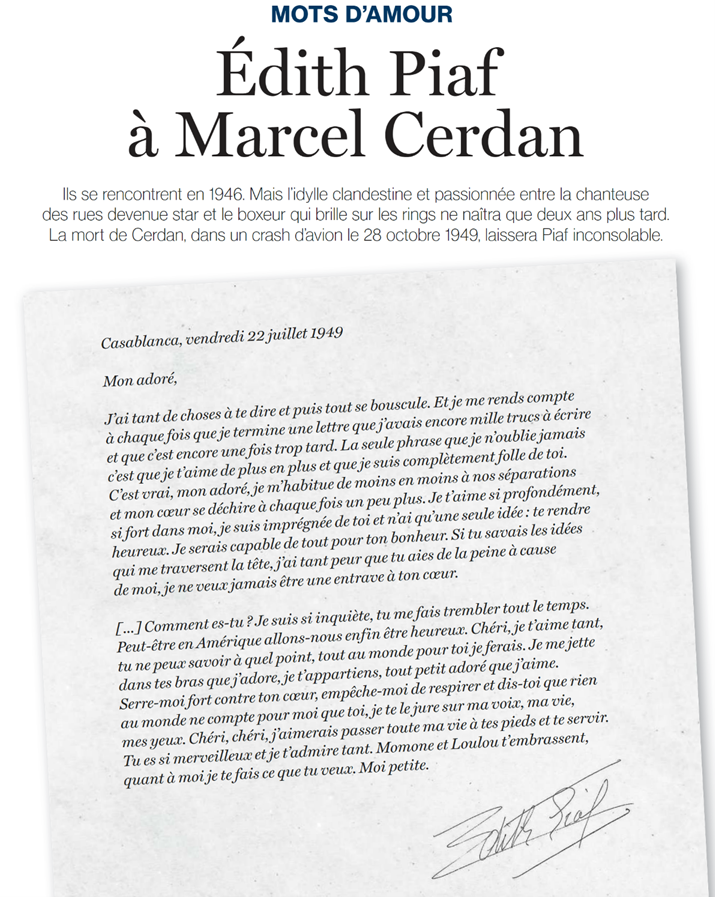 Par coïncidence, dans le journal aujourd’hui, il y avait une lettre d’amour que Piaf a écrit au boxeur Marcel Cerdan, qui est mort dans un accident d’avion en octobre 1949, en route pour la voir.