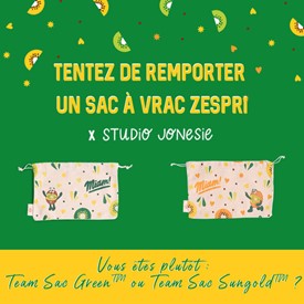 Vous verrez que Zespri™ propose des sacs réutilisables illustrés par Studio Jonesie pour réduire l’utilisation des sacs plastiques à usage unique. Pour 4 kiwis Zespri™ achetes, vous recevrez votre sac a vrac en Zespri™ SunGold™ ou Zespri™ Green.